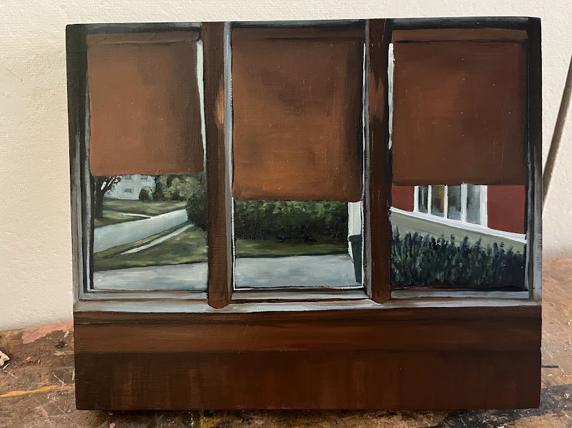 Watching the World Go By: After my friend committed suicide in the Fall of 2020, I haven’t been able to stop thinking about mortality, the inevitable death of myself as well as the people I hold close to me. My project, entitled Watching the World Go By, depicts this loss combined with my mundane moments of sitting in solitude, anticipating key events of life to come. The selected compositions show the waiting and watching that comes with being young, excited for life to start but wanting to freeze it entirely, already nostalgic for the present happiness of the moment while it is being lived in. To compose the paintings, I use video to record domestic scenes where I feel aware of myself in time, present in the beauty of the everyday moment. I watch the video repeatedly to find specific stills that I use as a reference for my oil paintings. This process combined with the care involved in crafting the birch panels I paint on, and the endless hours spent applying paint to the wooden surface, is a personal way to dedicate time and attention to the mundane moments in my life and the passage of time.